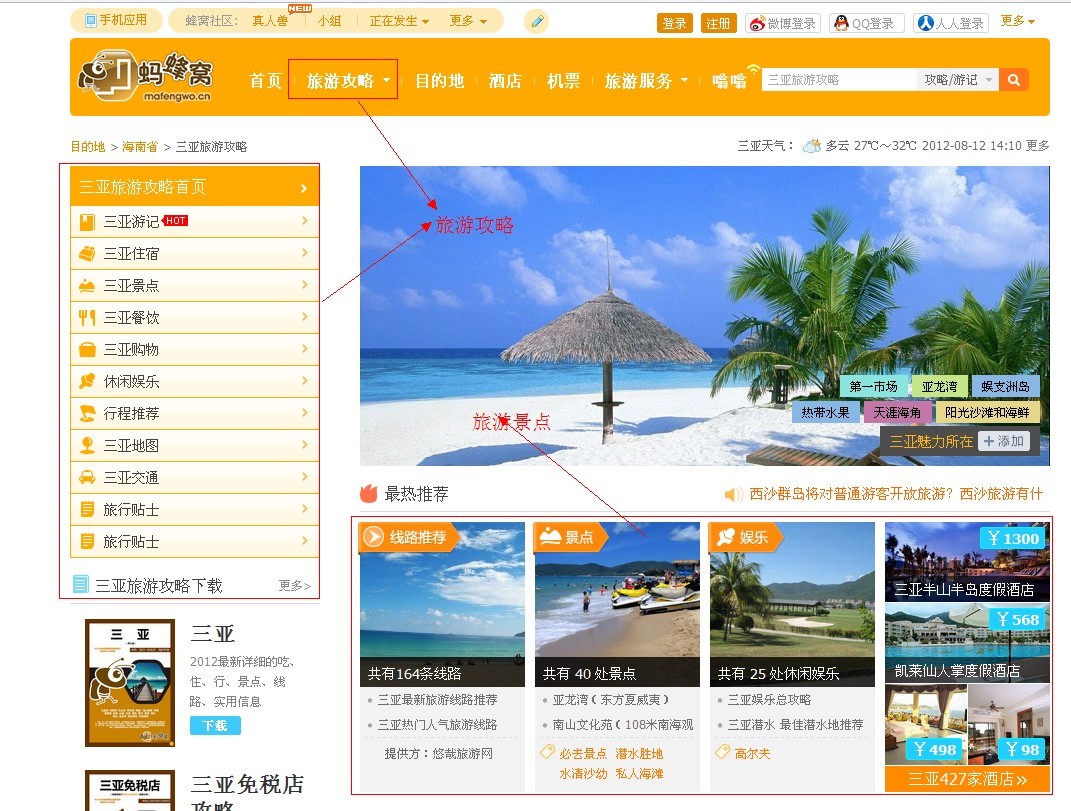 我们发现用户最大的需求是“三亚旅游攻略”和“三亚旅游景点”那么无论是在网站重要的位置(标题、导航、首页)对此用户需求予以展现。那么来看看排名第一和第二的网站是否这样做的呢? title>2012三亚旅游攻略,海南省三亚自助游攻略,蚂蜂窝三亚旅游网- 蚂蜂窝