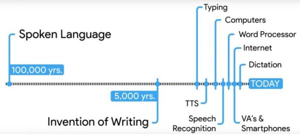 这一小节内容很多,干货满满,提供了非常细致的设计流程与方法的梳理,可以帮助设计师了解如何去思考、开始构建对话交互。在正文之前,还包含一个谷歌对语音设计Tips的讲解视频,图文结合的方式讲述的非常清晰,我也把核心内容听译了出来,配合截图与说明分享给大家。 上篇回顾:《谷歌对话式交互规范指南系列:对话式界面的概念和机制》 以下为设计tips视频的主要内容,视频链接:https://www.youtube.com/watch?v=MSUPVbbhIGA(需要搭梯子),非常建议大家看一下这个视频,讲述的很生动。 首先从宏观角度,引出语言对于人类的意义——各种创新、发明的源泉。语言的诞生历史非常古老,在长久的时间里形成了一些固有的惯例与原则,在设计对话UI时也需要遵循这些原则。以下是对人类的语言、书写、计算机等沟通方式的发展历程梳理。