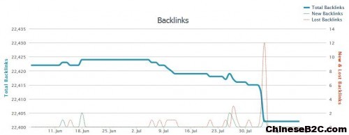 从上图:九块邮网站外链总数波动图,从波动图的趋势来看,整体呈下降趋势;从数量上来分析,下降的量并不大,在20条外链以内;从外链下降的原因上分析,主要是丢失链接大于新增链接,特别是在8月初,波动比较明显; 由上图可以分析出,这个网站的外链整体还是比较平稳的,原因主要应该是一部分网站给了整站链接,链接数量比较大,也比较稳定,另外这个网站也有一部分论坛外链,外链波动的主要原因应该是论坛外链丢失导致。