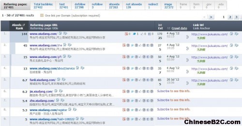 打开九块邮网站详细的外链列表查看,绝大部分外链来自于秀当网以及秀当网的几个分站,从这里面应该可以推断秀当网和九块邮网站同属一家,否则像这种淘宝购物导航类的网站怎么会给全站链接,而九块邮网站在黄金位置—导航部分添加秀当网的链接。 从外链下面的数据也查到一些论坛,像A5等一些论坛,和上面的分析是一致的。 从整个外链的数据来看,九块邮网站在接下来的操作中,需要加大外链的建设,因为这个网站的外链过于集中,像这种外链结构,风险非常大,一旦几个主要外链来源的站点被降权或者停止不做,九块邮网站将受到不可估量的损失。 目前比较紧急的是,安排好相应的外链计划,阶段性的增加不同域名的外链,加大外链域名总数,这样网站在搜索引擎中的排名能力会更加强大,搜索流量也会更加稳定。 四、关于九块邮网站站长平台数据分析 1.关于百度站长平台的数据