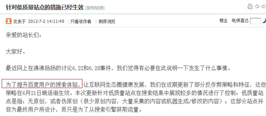 我们站长在做网站SEO时,一般情况下都把是搜索引擎作为重点,而将用户体验可能放在了次要地位,这样做的结果就是站长觉得网站各个方面对搜索引擎很友好,但是没有获得好的排名或是搜索算法更新时,自己的网站确受到了一定的影响的,原因就是在搜索引擎的眼里,它的目标是用户,网站用户体验不好,它就会认为这些网站对用户价值很小或是没有价值。 另外,我们会发现搜索引擎算法的每一次更新都以用户为中心,如百度6月份的6.22和6.28事件,有很多站长的网站受到了百度算法这次更新的影响,对此而不满。但是百度官方给出的解释见下面截图,站长就会明白这次更新旨在更好的提高用户体验。