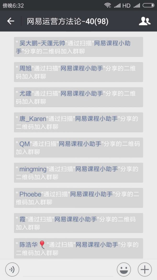 前1000名送资料 送资料这个噱头,我的猜测,可能是官方的冷启动策略,也侧面见证了,这次刷屏活动的效果他们也是心里没底的。和我们原来做刷屏事件一样,我们只是想灰度测试一下,没想到就点燃朋友圈了。当时我们只在账号存了2w元,结果后来20w都没够。所以,运营做不到提钱彩排,未雨绸缪的运营是个神话,大厂也不例外。 超级群管:我的地盘我裂变 报名的同学不知道有没有研究过微信群,吸引用户加群的目的就是发课程资料。我看群名,很熟悉:网易运营方法论-40,代表着我加入的是第40个微信群,群里到100人就不动了,因为微信群二维码扫码入群只有100人权限。所以这里面是有一个强大的微信群管系统在里面。