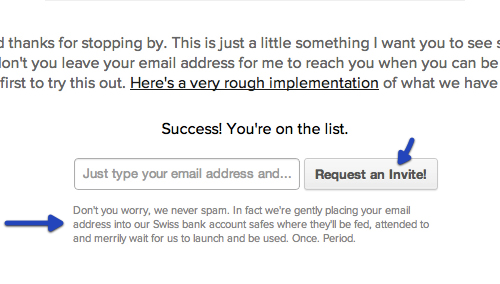 下面的范例来自我的一个个人项目,用户需要邀请码才可以试用这个产品。在提交申请的地方,我使用“我要获取邀请!”来代替传统的“提交”作为按钮当中的文案,希望这可以调动起用户的情绪,并使他们感受到一种更加真实、更加有针对性的互动。另外我也起草了一份简单的说明文案,让用户放心,我们绝不会发送垃圾邮件。