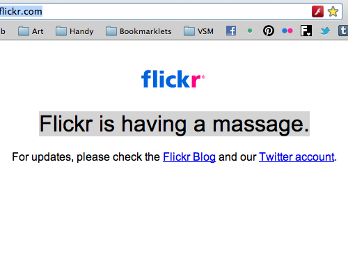 出错页面 没有什么比服务无法使用更能让用户觉得烦恼和沮丧的了,尤其当他们特别需要使用你的产品来完成重要事项的时候。如果这种情况因为某些客观因素而难以彻底避免,那么情感化设计至少能够在一定程度上缓解用户的负面情绪。 有趣的文案提示 用户在Flickr进行系统维护或升级期间会看到”Flickr正在做按m”的提示,如果有兴趣的话还可以到他们的官方博客或是微博当中查看当前的具体状况。这样的文案比起简单粗暴的出错提示来说更能让用户接受。
