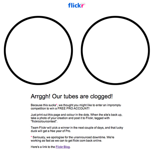 说声抱歉并提供有诚意的处理方式 同样来自于Flickr的案例。当系统发生了一些更加严重的问题时,他们会告诉用户:“额,我们的管道堵塞了!”,然后使用非常口语化的文案表示了歉意。除此之外,他们还为用户设置了一个小任务,也就是将当前页面打印出来,为两个圆环填色,然后拍下来,等到站点恢复正常后传到Flickr上;Flickr团队会挑选出优胜者,向他们赠送一年的高级帐号。