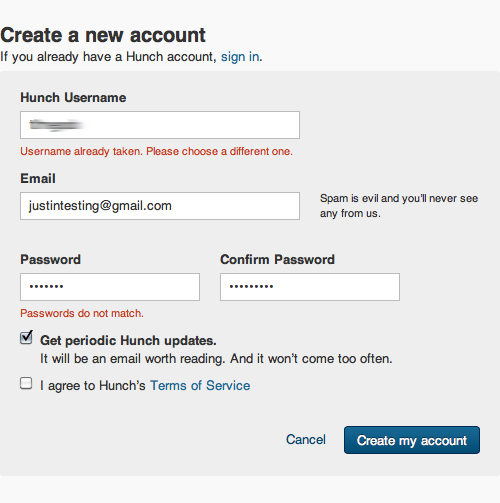 注释和说明 Hunch注册页面当中的文案与我们通常能够见到的那种有所不同,他们会在输入邮件的文本框旁边告诉你“垃圾邮件是魔鬼,我们可不干这事”,还会在选择邮件订阅的地方提示你“这会是值得一读的邮件,而且来的不会太频繁”。在这些很普通的地方稍稍花些心思,制造一些细微的差异化,这会增强产品的代入感,使用户的注意力更集中,跟随设计的指引完成操作目标。