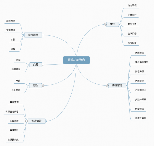 除了房客源主要功能模块之外,系统中的其他功能则会根据公司客户的需求不同而有一些侧重。 有些公司力求把系统做大、做全,中介交易中涉及到的操作流程都放在系统中,希望能把所有的流程进行线上化。所以这些系统中会完善楼盘、交易、财务、人事、运营等模块; 有的公司志在突出房客源系统,系统会增添一些辅助的实用工具:户型图设计、贷款计算器、电子地图、房客源云采集等工具。 有的公司则站在中介的角度考虑,全方位、多样式地向客户展现房源的详细内容。系统中则有详细全面的“房屋交易费用测算单”帮助客户了解购买房屋的费用,还有详细的“短信群发”来让客户了解房屋的相关信息,此外还能打印房源的“水印卡片”,便于随时发放给客户。 以下是一个普遍的、通用的房产中介管理系统的功能整理。