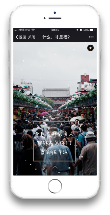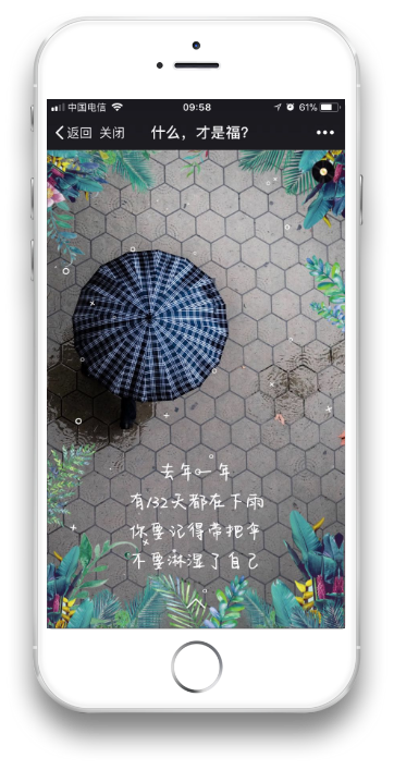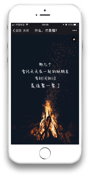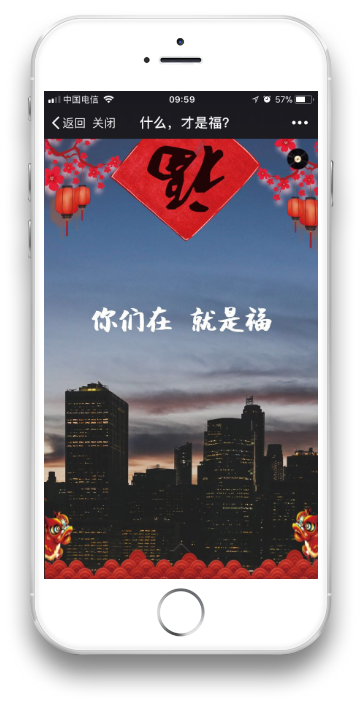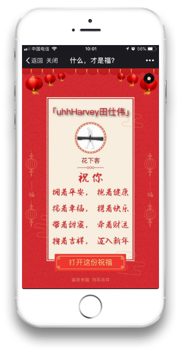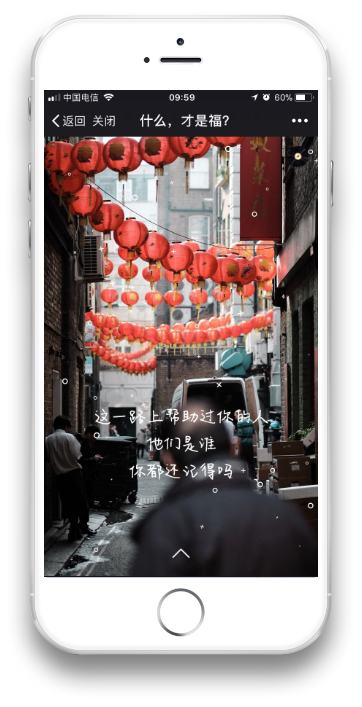 其实很多页面是有动态效果的。 比如有一张是一个背影,随着文字的出现逐渐出现了下雨的效果。 比如里面有几张是有火焰,一开始其实是一片灰暗,随着字体的出现火焰逐渐变亮,由冷色调变为暖色调。 这些细节上的设计都是经过反复测试的,从效果上来说画面感的确是很强烈。 (4)背景音乐 这一部分也是相当重要的,背景音乐一出现基本上就决定了整个情景氛围,在试听了无数的音乐之后,我们选择了一首钢琴曲,配合整个画面的确让人觉得走心。 带上耳机,调大音量,效果奇好。 如何实现交互? 没有交互的H5传播性会降低很多,因此一开始我们就在思考这个问题。 我们想让这个H5不仅是我们自己能够用,我们的客户自己也能够拿来用,他们能够把这个H5当成自己去给其他客户拜年的工具,这样会极大地提高传播。 于是我们在拜年的页面设置了一个功能,简单说就是你从哪个渠道点进来的就能够看到是哪个渠道提供者送给你的祝福。 举个例子,也就是我分享到我的朋友圈或者发给某个人亦或发到某个群里,某个人通过我分享的链接点进去最后在祝福那一页就可以看到我的微信名,显示是我送给他的祝福。 这样的祝福会让人觉得很特别,很用心。 页面效果这这样的。
