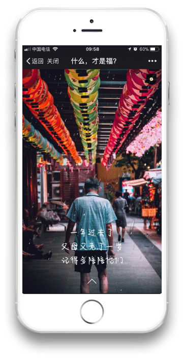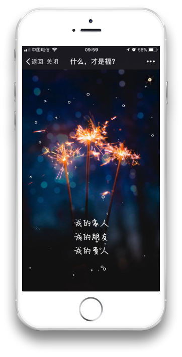 这其实也是一个万能的切入点,尤其是对那些品牌不够聚焦,行业不够细分,用户群体广泛的公司来说,实在想不到好的切入点就选择“人”这个切入点就OK。 接下来就是围绕“人”这个切入点打造H5的内容架构。 “人”如何与内容结合起来就是重点需要考虑的问题了,过年了,有那么多的人,问候、相聚、感谢这些都是关键词。 过年哪些人最需要去感谢? 无非是家人、朋友,提供过帮助的恩人,当然,还有自己。 感谢自己——感谢家人——感谢朋友——感谢贵人这就是整体的逻辑,再加上拜年送祝福的环节整个H5 的结构就完整了。 (2)文案选择 走心煽情的表现其实是通过画面、文字已经背景音乐营造的氛围来达到的,文案就成了这其中相当重要的内容,文案差了,煽情肯定是不能够煽情的。 这个部分不多废话了,来看看我们最后确定的文案。