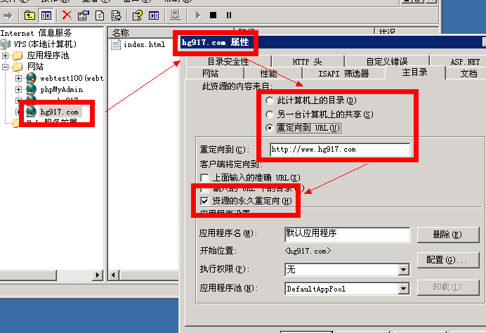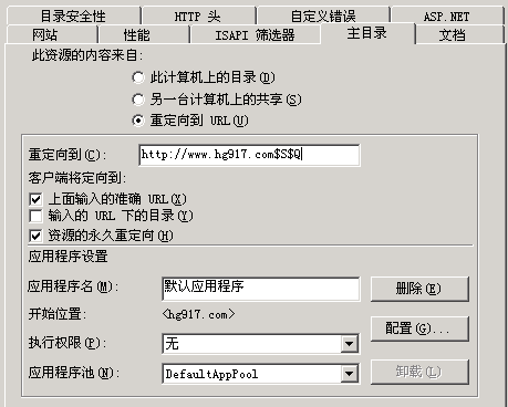 第二种情况,把重定向到 这种情况就比较简单,只需在上面右键属性---主目录,重定向到url,下面填上,再把资源永久重定向勾选上即可。 注意,如果你需要把域名后面带的参数都重定向到新的域名,并一一对应,你需要在重定向到的域名后面加上$S$Q,并把上面输入的准确URL勾选上。如图
