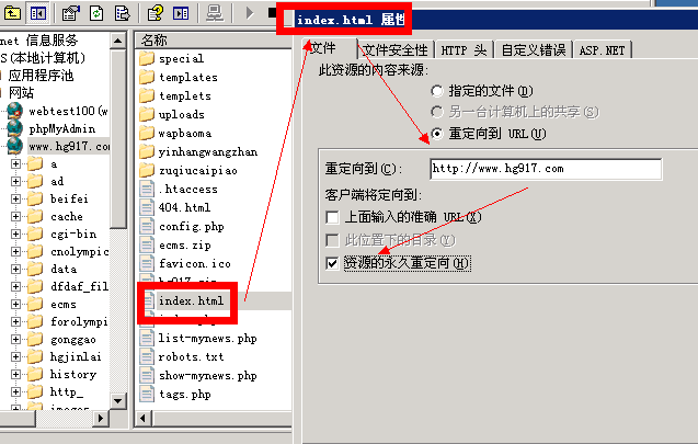 顺便解释一下:$S 将请求的URL 的后缀传递给新的URL,而$Q 则将初始URL 中的参数(如 querystring 参数)传递至新的 URL,包括问号(?)。 第三种情况 把重定向到 域名后面带上了后缀,这种情况很多人都遇到过,尤其是使用DZ的朋友,经常都会在域名后面自动带上了forum.php等后缀名,虽然说搜索引擎对此没有 明确表态说会分散权重,但还是有人实验过这两则之间的细微差别,从另一个方面来说,去掉了后缀,也使域名看起来更加清爽。 其实重定向这种情况和以上两种其实一样简单。 我们只要在IIS上点击我们要做重定向的网站,在右侧选中要做重定向的文件,如index.html,然后右击--属性----文件 选中重定向 ,在下面填入具体的网址,然后把永久重定向勾选上即可。如图