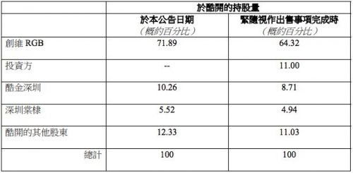 (注:投资方为百度完全控股的孜县百瑞翔创业投资管理有限责任公司) 交易完成后,创维RGB的股权从71.89%下滑至64.32%,仍为第一大股东。百度将以11%的比例成为酷开第二大股东。酷开估值达约91.8亿人民币。 2016年9月,百度旗下视频网站爱奇艺曾1.5亿元投资酷开,持股5%。2017年6月,腾讯3亿元入股酷开,持股7.71%。百度此次投资酷开后,百度系成为酷开第二大股东。