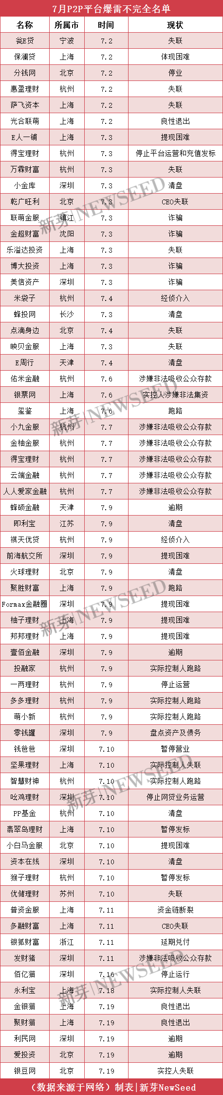 目前倒闭的网贷平台多数并非正常经营出了问题,而是本身的模式就不具有合规性、合法性,监管政策收紧所致的爆雷也是行业良性发展的必经之路。 除了政策原因,还有一些行业乱象以及羊群效应的影响。网贷行业中仍然存在着的庞氏骗局的演绎。利用高息理财的诱惑,让资金自动入局,再利用类传销的模式,拉新还旧,维系着高回报的神话。与此同时,不少P2P平台对外谎报“巨额融资”,给平台增信,一旦平台达到目的就可能很快跑路。这也是为什么很多平台刚刚宣布获得巨额融资,不久就出现项目逾期或者爆雷的状况。 人心惶惶引发的羊群效应导致投资人信心严重受挫,各大平台资金净流出非常严重,也是加剧爆雷潮的原因之一。但让人怀有希望的是,此次爆雷企业大多因为自身资质和合法性而“中招”,所以在此次大清洗之后,P2P行业的运行能更加合规合法。此次阵痛也犹如是成长之前的修枝剪叶了。 结语 “我就想知道,我们投的那么多钱,被平台投到哪儿去了?”渐渐平复下来后,表妹不甘地问。 校园贷、车贷、企业小额贷款……那些从银行贷不出钱的人,又或者她的钱被拿去兑付给了其他投资人。和上一波韭菜“折了棺材本”不一样,大妈们还有新中产子女,而子女成了韭菜,却提都不敢跟家人提。 银保监会主席郭树清早就给出了警告:理财产品收益率超过6%就要打问号,超过8%很危险,超过10%就要做好损失全部本金的准备。庞氏骗局不新鲜,新鲜的是有这么多年轻人,用这种方式试图缓解压力与焦虑。 附 7 月P2P问题平台不完全统计名单: