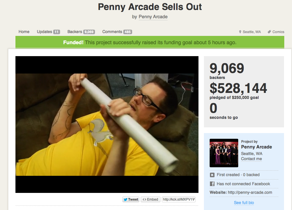 Penny Arcade是一个在线漫画网站,之前以贩卖广告位来维持正常网站开支。最近为了不让网站首页放置广告但又要有资金来维持运转,它们于上个月开始打算在Kickstarter上做一个实验,向粉丝寻求资金赞助1年共计25万美元,没想到这个目标在6分钟内就超过了52.5万美元。 该活动吸引了很多高额捐赠者,有一位捐赠者以与网站的两位创始人Jerry Holkins 和 Mike Krahulik共进午餐为由捐了9999美元,另有两位捐赠者为了能在Penny Arcade 实习一天捐赠了7500美元(当然这实际上是以实习为名进行的捐赠了)。目前该实验已经结束,最后募集到528144美元。