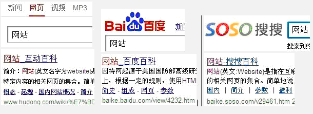 如上的截图,就是搜索的对比图,可以看到这些数据,初步的话不要怀疑百度的数据,毕竟这些年过去了,积累下来的数据权威性太大了,相较于seo这个关键字而言,360综合搜索的提示关键字数据差异还是有一些,没有给出更多的搜索提示,也只能说明数据的偏少造成的,从这一点说明360搜索还是需要努力的。但是搜索电影的话,却发现电影热门关键字诧异不大,这些可能也是通过数据的来的,毕竟通过360导航搜索的用户也是极多的,相信收集里面的数据对于360来说也不成问题,这些也是数据的一个来源。如果说这真的是数据的来源的话,从另一方面可以说明,那就是将360导航作为搜索入口的用户很多都是最直接的用户,而不是对搜索具有一定的了解的人,也就是seo人员吧。 初体验之二:搜索引擎选择百科类型不同 国内有百度百科,搜搜百科,以及互动百科,这三大百科分别对应的是百度搜索,soso,以及刚出来的360搜索,大家看如下搜索“网站”关键字的截图对比