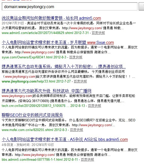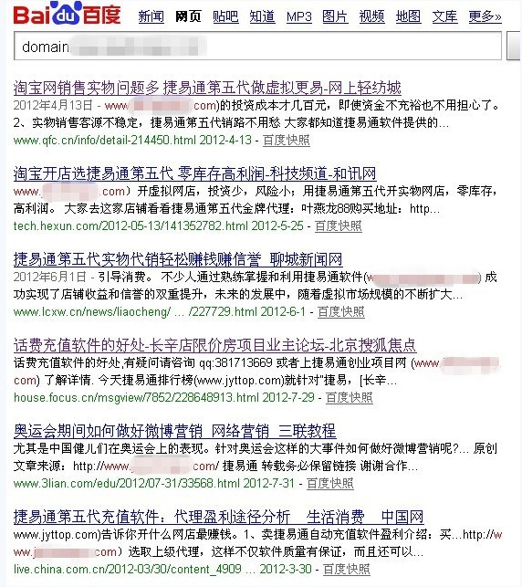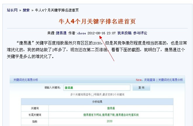 大家好,我是邓堪豪,很久没有在A5写文章投稿了,因为最近都在于淘宝和淘宝客的站点,东西太多了,最近一直在玩一些淘宝客的一些项目,有时间就会跑来A5或者站长之家这些地方看网友分享的文章,今天正好一大早六点多起来看了几篇文章,分析了以后,我们觉得这个捷易通这个词排名情况之前有一位朋友分享过,不过我们今天就拿他的网站来分析。 他所写的一篇文章是牛人4个月关键字排名进首页 这些文章名字是不是很吸引人呢?呵呵,是的,我也被吸引进来了,我很认真看作者分享的文章,看完以后我去看了一下他所说的站点,虽然他图中都没有让我们看到域名,但是我们可以在搜索关键词时找到他所说的这个站点。有些新手可能不知道如何查找。下面请看说明: 第一搜索:捷易通 关键词 他在A5投稿时间是前二天,我们今天是18号,所以是二天,就算排名有变化也不会太快的。