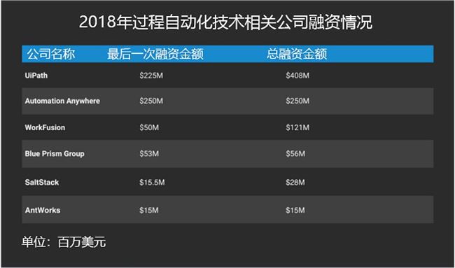 【猎云网(微信号:ilieyun)】 10 月 2 日报道(编译:Henry) 坐在办公桌前做着重复性的工作往往是上班族的常态。然而近几年来,职场管理者们都开始绞尽脑汁地想要用各种方式将这些重复性的工作外包给机器完成。 许多风险投资者和成长投资者正为加快工作机器人时代的到来做出各种努力。今年到目前为止,他们已经为机器人过程自动化技术的开发投资了数亿美元。而通过该技术,机器人就能够代替人们完成许多重复性工作。 上周,过程自动化技术的融资活动收益颇丰。此次融资由红杉资本和Alphabet的CapitalG公司领投,其中UiPath这家总部位于纽约的行业巨头为其提供了2. 25 亿美元的巨额C轮融资资金。这次融资为这家拥有 13 年历史的公司提供了超过 4 亿美元资金,其最近的市场估值高达 30 亿美元。 根据机器人过程自动化技术相关的初创公司和成长型公司的资金分析,今年对该领域来说真是不平凡的一年,到目前为止至少有 7 笔大额交易的总投资金额超过了 6 亿美元。 下表为 2018 年相关公司的几轮大额融资情况: