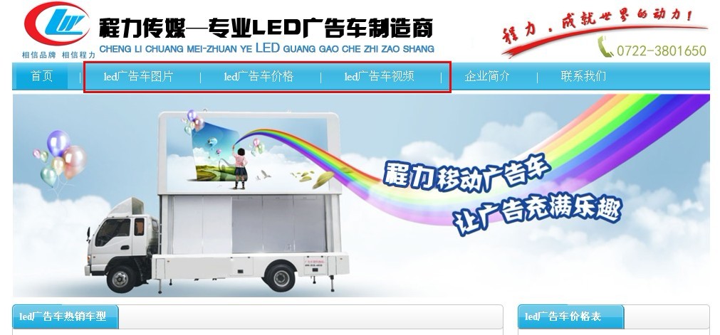 以上红色方框内的为我网站的关键词,一共是有洒水车、油罐车、随车吊、垃圾车、冷藏车、化工车、液化气槽车、高空作业车这8种类型的产品,意思就是说一个蛋糕我分成了8份,所以每个关键词获得的资源是非常少的,这个网站已经上线半年了,但这些关键词依然是没有排名的。没排名当然也是很正常,因为我的竞争对手的网站虽然网站中也是这样几种车型,但是在他们标题和外链中,都是只是侧重某一种或者两种车型,所以相对来说他们是更具竞争力,所以我这种大而全的想法是非常失败的。这种想法让我痛定思痛,开始向小而精的方面去发展。今年6月份公司推出了一款新的车型,叫led广告车,说是要我把这个产品添加到我的网站上,但我坚持要重新做一个独立的站点,来验证我的见解。终于花了半个月的时间,网站建设包括产品上传已经全部完成,请看下图: