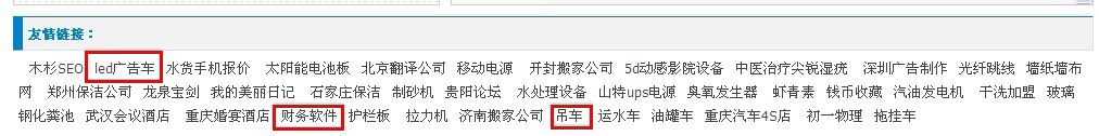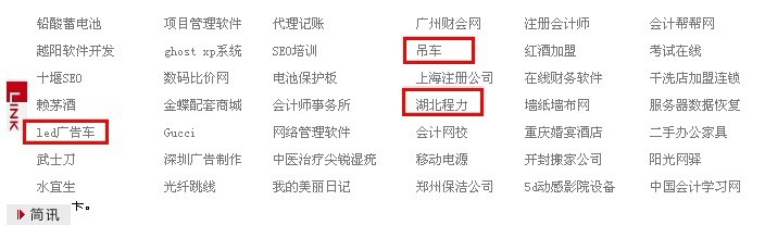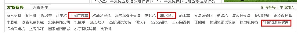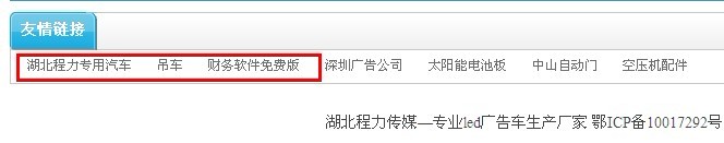 湖北程力(A站点) 以上红色标注的led广告车、财务软件、吊车三个网站是我第一个网站的友情链接,而这三个友情链接同样也存在于我的一个新站上,请看下图: