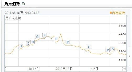 在搜索框输入led广告车这个关键词,推广助手就会精确地提供这个关键词的搜索数据和相关关键词的数据,我们通过相关搜索关键词可以确定用户搜索led移动广告车、led广告宣传车这些关键词的频率是比较高的,这是我们在网站中目标关键词外要进行长尾关键词进行拓展的目标。这样我们就可以有目标的进行长尾的拓展了,而不是凭借自己的直觉,用户搜索决定了一切。你做得再好,没用户进行搜索也是没有任何意义的。 百度指数是我们进行关键词分析必须要用到的一款工具。打开百度指数,输入你想查询的关键词,我们首先能看到的是一个关键词热度的趋势图,这个词直接可以体现某个关键词在不同时期或者不同季节用户需求的变化。以海南旅游为例,请看下图: