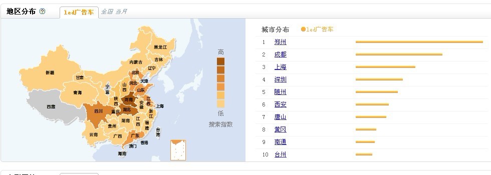 从上图可知,海南旅游是具有季节性的,每年的10月份到第二年的三月份是海南旅游的旺季,那么如果我们是做海南旅游的网站,我们可以在10月份之前把今年海南旅游攻略放在我们的网站上,然后再向客户介绍一下冬季去海南时要注意哪些事项,那么这时用户肯定是非常喜欢的。所以我们要根据季节的变化对我们网站的内容进行调整。在夏季的时候,我们可以在网站中介绍一些比较凉爽、比较适合避暑的景点,或者是夏季海南旅游防晒攻略,这不适为一个很好的方法。而冬季则可以为客户介绍一些日光比较足的景点,让客户充分享受下海南旅游景点的阳光。如果你在夏天的时候网站中还出现一些冬季的旅游攻略,那对客户是有伤害作用的,所以我们得进行很好的掌控。 再者,我们可以通过百度指数进行关键词的地域性统计。通过地域性的统计,我们可以找出我们的目标客户群体所在的区域。以我公司的led广告车为例,请看下图: