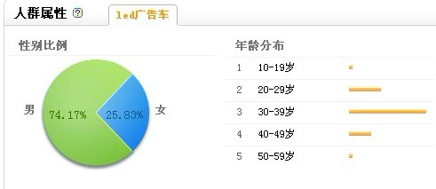 从上图可知,我司的led广告车的主要市场是在河南,这个百度是通过全国各地数据统计对比而得出的,那么我们可以考虑把我们的空间或者服务器放在河南,因为河南占据了我们用户群体的大多数,他们的打开速度更快,那么我们就是方便了用户。这个也可以为我们的百度竞价甚至是线下的销售进行指路,找到用户需求量最大的地域,进行重点布局。 百度指数还可以看一个很重要的数据,那就是用户的性别和年龄。请看下图: