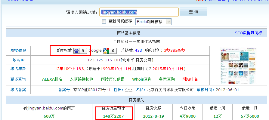 百度百科是百度在2010年推出的一个新平台,其主要是用于分享生活工作学习中遇到的点点滴滴经验。我们不得不承认,百度每次推出的产品都能获得其自身搜索引擎的青睐,我们可以通过站长工具看到,百度经验的百度权重值达到了9,具体如下图所示。而这也是为什么很多seoer对百度经验趋之若鹜的原因,那么是都百度经验外链就是传说中的高质量外链,这需要我们追本溯源更加深入的分析。