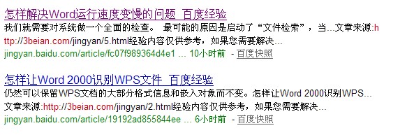 在上图中我们可以看到百度经验有着极高的权重值,很多关键词都位居榜首,很多站长都希望借助这一平台推广站点,获得权重的传递。百度经验确实一个推广站点不错的平台,但是笔者想要说的是如果你想借助百度经验获得权重提升排名的话,那么你的算盘就大错了,百度经验并非传说中的高权重外链。 笔者的站点时一个计算机使用教程网站,网站的内容很符合百度经验的内容需求,于是笔者通过自身的内容很容易的在百度经验上获得了几条外链,而且这些外链都可以很好的被收录,如下图所示。