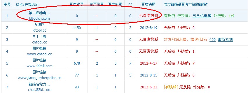 第一联动五金机电城这个网站在7月1号的时候收录被剔除,只剩下首页,在8月17号的时候关键词排名都掉了,经过分析,造成网站被降权的原因主要有以下几个方面: 1、链接权重丢失,及友情链接牵连降权 第一联动五金机电城这个网站虽然没有友情链接这个版块,经站长工具友链链接检测,还有多个导出链接(如图),你打开网站也可以看到在网站底部和头部导航这里就是导出链接的位置。 而且竟然做的都是全站链接,权重丢失严重。从图中还可以看出,ldtoolcn.com这个网站已经被百度k掉,牵连降权可能性也非常大。