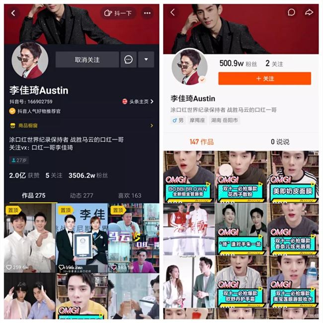 媒体曾给李佳琦写过一篇专访,标题是《幸存者李佳琦》。李佳琦很喜欢“幸存者”这个定义,也觉得非常贴切。他觉得“一个人更大的幸运,是在发现自己使命的时候,遇到了风口”。 2018 年 9 月,李佳琦成为吉尼斯世界纪录“ 30 秒给最多人涂口红”的保持者。他把去年双十一自己直播间的爆发视为第一个爆发点。 第二个爆发点是短视频。他从 2018 年开始做短视频。初期,同事让他每天下午到公司拍,但是一下午可能一条都拍不出来。因为,他觉得“这不是我发自内心的”。 后来,他们尝试了一种新模式——“主播真人秀”。他会在直播的时候试用推荐的产品,无论是好是坏,都会被剪进短视频。短短半年时间,拥有了 3500 万粉丝。