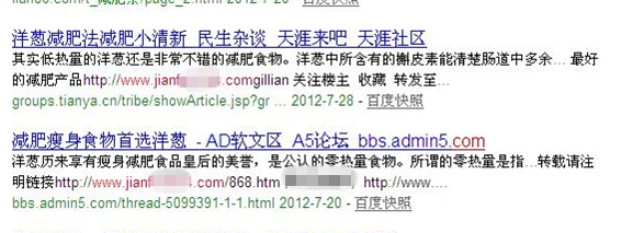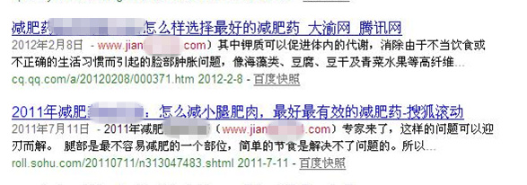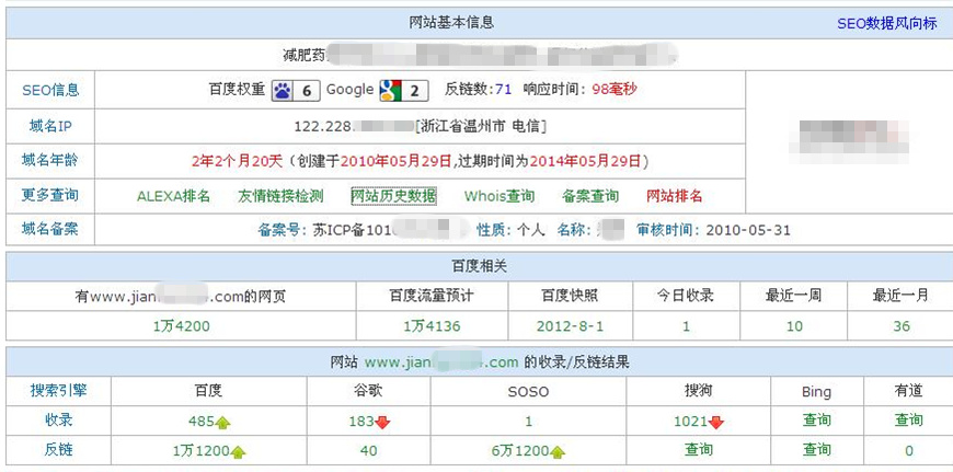 2、该站基本信息!百度权重6,说明不但主页关键词做的好,长尾关键词依旧出色,这肯定离不开强大的外链建设!百度快照在8月16日查的才显示8月1日快照,看来大家不用太迷信这个快照啦!收录485,按域名年龄来说,每天收录不到一个,应该不是靠原创内容数量取胜的站,估计原创质量高,且被转载多,带来的外链多!看外链,估计很多站长都会很不屑的说,才一万多啊!!对,就一万多,虽然百度外链不准,但不会误差那么大,就是这个外链只有一万多的站,将竞争最惨烈的减肥类关键词做到首页第二位(第一是网易的内页),还连同长尾关键词把整站百度权重做到6。这更值得我们去仔细研究一下这个站的外链建设!