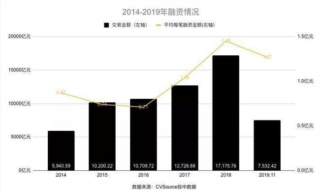 多位投资人告诉投中网,受大环境经济影响,创投圈的确“低迷”。不过这种情况更多针对小投资机构,而头部机构的钱依然充足,只是出手更为谨慎,对项目的要求更高。对好的项目,投资人该出手时仍会出手。 CVSource投中数据显示, 2019 年前 11 个月交易频次仅 5916 次,不足 2018 年全年1/2。但平均下来单笔投资并不没有减少。具体来看, 2019 年平均每笔融资达1. 27 亿元,为 2014 年以来第二高——低于 2018 年的1. 45 亿元。