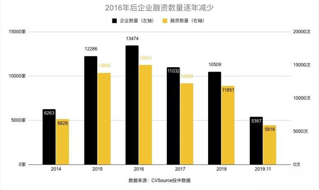 2019 前 11 个月,创投圈整体融资交易规模不到 2018 年的一半,头部机构出手更谨慎。互联网仍是最受欢迎的被投领域,汽车和物流则稳居单笔融资规模榜首。 2019 仍然是被创投圈称作“资本寒冬”的一年。 这一年,王思聪因熊猫直播关闭引发的法律纠纷屡次成为舆论中心;最受创投圈关注的淘集集也宣布因融资失败而破产。同样因资金问题遭遇困境的还有生鲜电商吉及鲜、呆萝卜等。 的确,数据也显示今年创投圈融到钱的项目越来越少。根据CVSource投中数据统计, 2019 年前 11 个月仅有 5387 家企业拿到了融资,不足去年的1/2。同时,整体融资规模也在下跌。 2019 年前 11 个月创投圈整体融资交易规模为 7532 亿元,仅 2018 年的43%,亦是 2015 年以来最低交易规模。