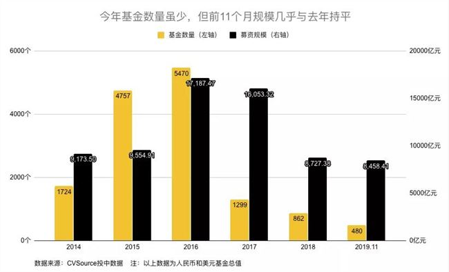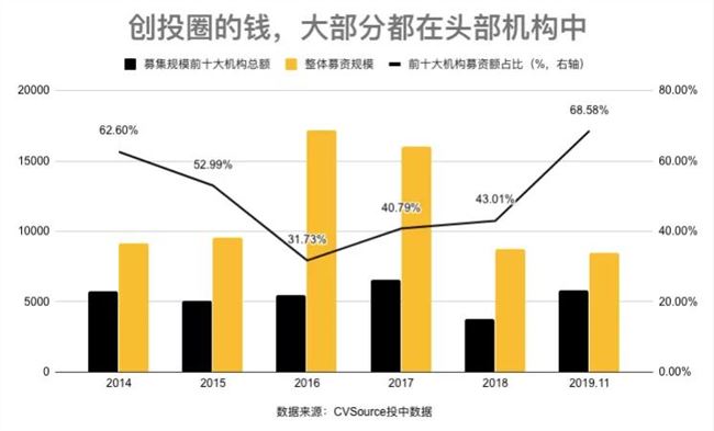 正如多位投资人所说,创投圈的钱,大部分集中于头部机构。CVSource投中数据显示, 2019 年前 11 个月募集资金的前 10 家机构共募得 5800 亿元,占了整体募资的68.58%。 “投融资不乐观主要是对小机构(而言),头部机构钱很多,而且还(可能)钱投不出去。”上海某资产管理公司合伙人李一凯告诉投中网。