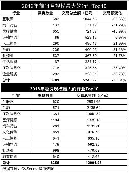 和 2018 年相似, 2019 年投资人的钱流向的主要投资领域集中在互联网、汽车、健康医疗、运输物流等行业。CVSource投中数据显示, 2019 年1- 11 月,规模最大的十大行业共拿到 5243 亿元融资,占前 11 个月整体交易的七成。 互联网行业仍然是融资规模最大的行业,今年前 11 个月交易总额1044. 76 亿元,但比 2018 年减少了63.36%。 总体来看, 2019 年前 11 个月前十大行业融资规模均比 2018 年下滑。其中交易规模减少最大的是文化传媒,从 2018 年的976. 76 亿元减至151. 35 亿元,少了84.5%。其次是金融行业,从 2018 年的2136. 64 亿元减至今年的400. 03 亿元,少了81.28%。 这与今年P2P、影视监管趋严有关。 2016 年互联网金融开启了风险整治,据银保监会公布的数据,截至 10 月,全国运营的P2P机构从 2016 年的 3000 家降至 462 家。而影视行业自 2018 年政策收紧,“限薪令”推行,整体进入了“艰难状态”。天眼查数据显示, 2019 年以来,有 1884 家影视公司关停。