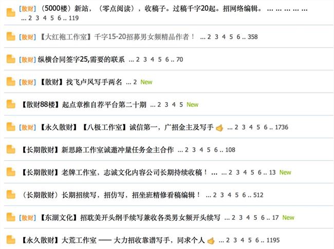 时清通常会根据项目重要程度和时间期限来确定创作模式。重点作品多是团队立项,再由擅长该类型的写手执笔;一般作品由编辑策划,再分给职业写手执行;冲量作品要求宽松,基本是兼职写手负责。“你要是遇到小说前后风格不同,很可能是团队作品,尤其是更新了上千章的。”她对硬糖君透露。 因为工作室写手擅长女频题材,他们这几年主要创作女性向爽文,包含大量王妃文学。流水线的内容生产虽然高效,但也意味着他们严格遵循商业化的创作套路和分发策略,与大众爆款注定无缘。 今天的网文市场里,有着无数的时清工作室。贴吧、豆瓣、写手论坛里,经常能看到编辑收稿、招人的帖子。在写手BBS“龙的天空”的黑市板块,一本完整的小说被拆散成大纲、开头、结尾等“零件”,公开叫卖。
