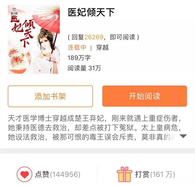 不同于起点、晋江等大站,腰尾部小说平台没有稳定客群,需要借助更多渠道来进行推广和变现。 2017 年左右,小说分销团队扎堆涌现,为网文圈带来了新的变现思路。 小说分销商先囤进适量小说资源;再以加盟、代理形式发放到公众号这一次级渠道,搭建书城站点;在公众号端,读者通过会员充值、单篇打赏产生消费。 据时清介绍,小说分销商采购版权的成本价较低,多数甚至是盗版抓取。“他们不追求量多,搞个千八佰本小说都够吹了。想要挣钱关键是作品够爽,推广够浪。” 硬糖君做公众号至今,也遇到过大量“小说接吗”的商务合作。原以为是写手营销作品,或影视公司炒作IP,没想到背后竟是门微商生意,无知令我与暴富再次失之交臂。 随机观察了十多个代理小说公众号,硬糖君发现他们书城的设计都简洁明了。以女生、男生分列,再根据热度排序。打赏则以虚拟币划分额度,通过微信充值。 在名为“xx好文”的公号里,《医妃倾天下》以 14 万点赞, 161 万打赏位列排行榜第一。按 200 元/ 20000 阅读币的优惠价来算,这本作品收入 8000 元。抛开上级扣量的因素干扰,分到公众号代理手里在 5000 元左右。