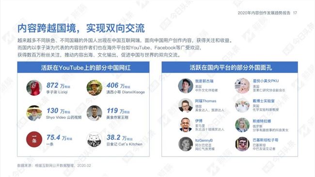 银发下沉市场体量持续提升, 内容创作突破年龄地域国界 其二是创作者规模持续增加,下沉市场体量增长。 以微信公众号为例,截至 2020 年初,创作者数量已超过 2000 万。而近年来一直备受关注的银发和下沉市场,创作者的数量也在稳步增长,并涌现出一批优质的头部创作者。 在头条号粉丝积累超 1021 万的@张召忠 今年 68 岁,退休后才开始做新媒体,却收获众多年轻用户。再如在抖音积累粉丝超 1381 万的@末那大叔,视频中末那大叔的父亲北海爷爷今年 74 岁,但凭借精致的生活态度赢得诸多粉丝。下沉市场的内容表现同样值得一提,例如在快手粉丝积累超 1051 万、来自河南濮阳的@农村会姐。 这些创作者不仅在单个平台上拥有千万级粉丝,在其他平台乃至全网也有一定的影响力。 此外,内容创作突破地域界限。过去一年,越来越多不同肤色、不同国籍的外国人出现在中国互联网端,面向中国用户创作内容,获得关注和收益。 而国内以@李子柒 为代表的内容创作者们也在海外平台如YouTube、Facebook等广受欢迎,获得数百万甚至近千万粉丝关注,推动内容出海、文化输出,促进中国与世界的双向交流。