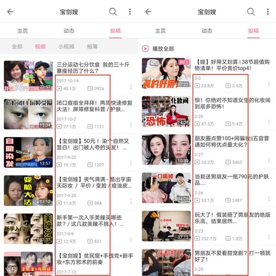 可能就是如她所言:“漂亮的美妆博主太多了,大家对‘漂亮的博主通过化妆变得更漂亮’习以为常,而认为‘普通博主化妆变好看一点’更有看点。” 普通博主不普通点开宝剑嫂的B站或微博账号,可以看到大部分视频播放量都在 30 万次(B站)、 150 万次(微博)以上。比如一个名为《中国式审美?百年妆造变迁 万元绝版古装 故宫高清实拍!》的视频在B站61. 9 万播放,微博 267 万次观看,获微博时尚美妆日榜最高第 2 名。再比如,《超显白橘子少女日常妆I 烂脸期最爱妆容分享》B站74. 4 万播放,微博阅读量达 514 万,播放量破 218 万,互动量达27000+。