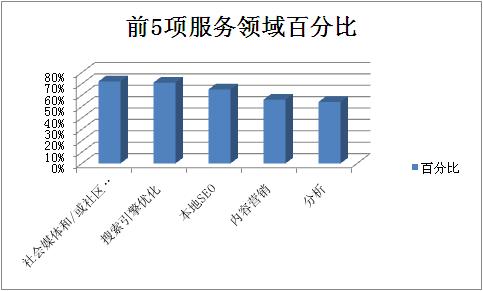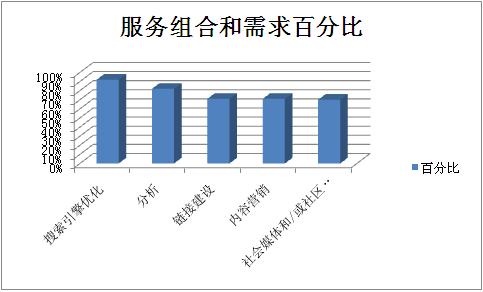 从图表内容中我们可以看出中国的营销比例很微小。 3、多面手VS专家 工业发展的需求使得营销人员倾向于专业,而在2012年的调查主句中表明,47%的受访者表示,他们将“保持广义”或“变得更广义”,而39%会保持或变得更加专业。当被访问到他们每天会花多少时间在各种互联网营销策略研究上,他们的回答很惊人,对于每一个策略是1 - 25%或更少的季度时间。大多数互联网营销人员仍然戴着超过一个帽子。 4、服务组合和需求 我们是做什么的?我们需要什么?92%的受访者有seo服务作为他们部分的组合