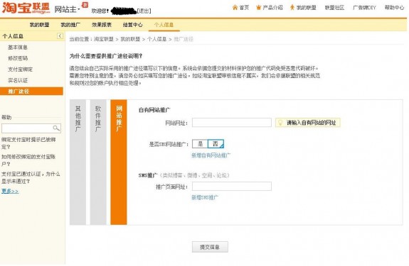 尊敬的淘宝联盟会员: 为了规范淘宝客市场,同时也为了保护您的推广代码免受恶意代码破坏,从2012年8月23号开始,若您需要提现您的收入,需先提供您的推广途径说明。需要特别提醒您的是,请您务必如实填写您的推广途径,如经淘宝联盟审核信息不属实,我们会依据联盟的相关规范和规则对您的账户执行相应的处理。 操作步骤: 请先登陆淘宝联盟帐户--进入我的联盟--个人信息--推广途径,进行填写信息; 目前有三种类型可以选择:网站推广、软件推广、其他推广,请根据您实际的推广方式选择填写; 网站推广: