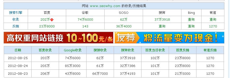 在图2中,我们不难发现,8月22日的百度反链还是922,第二天就直降到531了。这就是说,从8月22日,百度的扫荡就开始了,而到了昨晚的9点50左右达到了顶峰。 在观察了自己的小站以后,同时我也问过其他的站长朋友,他们大都反映,影响较大,有的是收录影响较大,下降得厉害,有的关键词排名从首页直降到100名以外,有的两种情况都存在,最惨的是瞬间网站被k。 那么百度昨晚行动了,谁受牵连了呢?通过山东seo不完全调查,发现:本次受伤最重的是seo及其相关网站,其次是垃圾站点和作弊网站。 下面不妨引述8月22号百度站长平台的一篇《百度算法升级,将影响作弊站点收录及低质站点的排序 》的文章对本次百度发飙所殃及的网站()的一个说明: 1.乱采集内容,语句不通,读者无法从中获得需要的信息。 2.内容虽然可读,但是绝大部分文章是采集、复制自其他网站,本身没有原创内容。 3.网页中穿插堆积关键词或文章与主题不相关,企图欺骗搜索引擎,对搜索相关关键词的用户没有实质的帮助。 4.冒充官网欺骗用户,在title和meta标签中声明不真实。 虽然这四条并没有特别提出要重点打击seo行业网站,但从调查的结果看,这类网站受伤最厉害。下面我选取了seo、医药网和减肥三个关键词,各选取很靠前的两名进行统计,大家来看下站长工具的统计图表: 1.seo类: A.seowhy网站