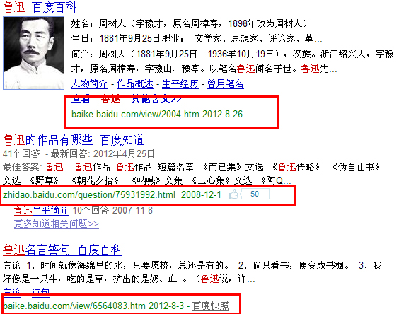这是一张网站快照的截图,别的域名还没申请,你竟然就有了它网站的快照。即使是一个老域名,域名掉了之后,再注册做的站点,也不应该有这样的快照事情流露出。从你的不严谨里,多少技术相关人员对你鄙视之?这样胡乱的数据轻易地,不解释地就跳出来了,你作为搜索引擎技术的代表,难道不需要反思自己?你这不是在摧毁你自己吗? 2,不公平 不管是站长也好,普通网民也好,在互联网里,需要的就是公平。下面是一张搜索鲁迅的截图: