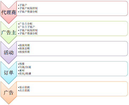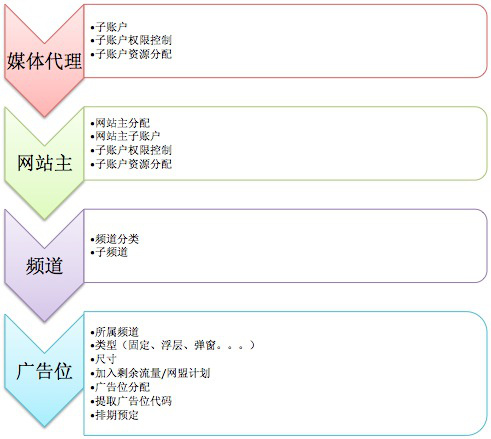 解释: 1、代理商:指为广告主提供广告代理服务的公司。如实力、传力、奥美等我们经常提到的4A广告公司,还有华扬等local 4A广告公司等。在有些系统中,代理商也被叫做渠道。 2、广告主:指广告所宣传产品的生产商,也是实际支付广告费用的机构。广告主并不需要一定有代理公司,因此在系统中,广告主可以处在最高层级,这个时候我们称这个广告主为直客,即直接客户。因此在有些系统中,广告主被称为客户。 3、活动:活动的相关设定是根据我们现实中签署的合同来设置的。因此他是合同在系统中的体现,他主要包括投放周期、投放总额以及投放的媒体等相关信息。 4、订单:订单是活动的进一步细化,在活动设置的基础上加入了素材和投放策略。但订单还不是广告投放的最小单位,广告才是。 5、广告:广告是系统进行投放的最小单位,一个广告中包含一个素材以及素材对应的显示监测和点击监测。有时候我们在有些系统中并没有看到一个叫”广告“的列表界面,但这并不意味着系统投放核心进行投放时候没有用广告概念。不管是那个系统,最小的投放单位一定是”一个素材及素材对应的显示监测和点击监测“。 Google作为网络广告的典范,国内的广告公司或者业内同学一定会研究Google的相关系统,例如Google Adwords。Google Adwords结构设计和上述所列结构设计的对应关系如下(顺便列出了百度推广的对应关系): Google AdwordsBaidu 推广上述结构 广告系列推广计划活动 广告组推广单元订单 广告创意广告 广告系统的结构设计——网站端 广告系统从根本上讲只是一个帮助广告主和网站主进行媒介资源买卖的平台,因此一个广告系统不可能是单一的只有广告主没有网站,或者只有网站主没有广告主。广告系统中网站主的结构设计和权限设计如下:
