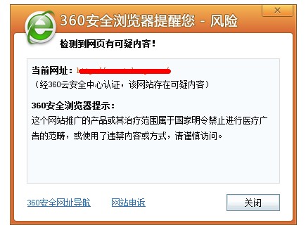 以上这幅图是在360综合搜索里搜索减肥药的结果,该站原本在百度里是长期保持前五的位置,然而今天不见了,综合搜索里它却占据着第一的位置,大家可以试着观察下,在百度排名掉了的情况下,它能在综合搜索里能屹立不倒多长时间。 更加有趣的是,当你网站的排名因为百度的不稳定从百度消失后,综合搜索里也难寻网站的踪影,但是过些天百度排名又回来了,难怪这些天大家觉得360在搜索领域并无自己的技术,不废吹灰之力窃取别人的成果。原本和大家一样,本以为360搜索的来临给我们这些草根站长带来了生机,多了一个机会,但在前几天百度更新后,笔者的网站排名在百度里消失了,沮丧之情无言以表,只能依靠于综合搜索给予安慰,让笔者的小站屹立不倒,然而事与愿违,在综合搜索里也难寻踪影.....在笔者消沉了一天后,百度排名奇迹般的回来了,虽然是掉了一位,但这毫不影响笔者的兴奋之情。笔者再一次打开360综合搜索,但这次的心情非常放松,而不是之前抱着救命稻草的态度,不管综合搜索给予什么样的结果,由它吧。但最终结果是,综合搜索里的排名也回来了,这是干什么!草根站长有难时你不挺一挺,人家现在没事了,你也跟着回来了。这让我们怎么想? 360综合搜索来临垃圾网站站长的末日 360旗下有360卫士、杀毒、浏览器,以360卫士切入,一环扣一环,使得360浏览器在国内占据主导地位,也许很多做过产品站的站长会有这样的经历,网站被360浏览器封杀,打开网站弹出大大的警告提示框!警告图如下: