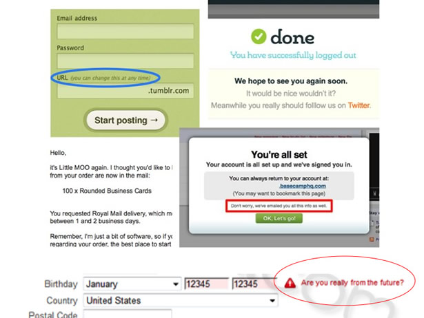 8.缺乏情感和个性 要为产品赋予恰当的人格。长久以来,我们一直将注意力放在功能与可用性等方面,现在是时候来考虑一下怎样在产品体验当中融入个性了。 无论是打造一款在线应用,还是简单的展示页,你都可以在设计方案当中尝试情感化的设计思路。无论风趣、友好、严肃、谨慎,只要设计方案所体现出的人格气质符合产品自身的特质,它就可以在用户头脑中产生长久而深刻的印象。 推荐阅读:为产品赋予人格 – 情感化设计的组成要素及实践案例