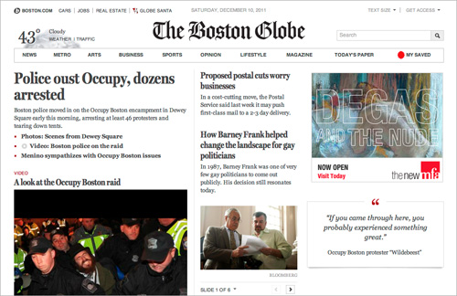 微软Metro风格的设计受到了触摸优先思想的影响 响应式设计,达到统一设计的目的 虽然关于响应式设计的很多讨论都是关于响应式设计技术的,但响应能力本身并不是最终目标。它是达到目的的一种手段。设计具有响应能力,是为了达到其他的一些目的。可能为了支持不同的内容,服务于低宽带中传输的图片,在更小的屏幕中更好地展示布局。也可能为了在大范围不同的设备上提供统一的体验。 搭载响应式设计的火车,可以到达统一的用户体验设计的目的地。 Boston Globe网站在这方面做得很棒。