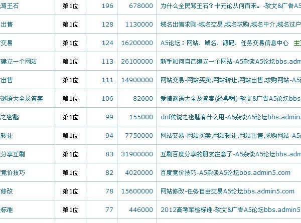 A5论坛目前的百度总收录数量为340万,谷歌为240万贴左右,通过查看A5论坛的历史收录,基本上A5论坛每天的收录数量都在百万贴左右。所以A5论坛是提升网站权重必上的网站。 A5论坛在百度的各项关键词排名