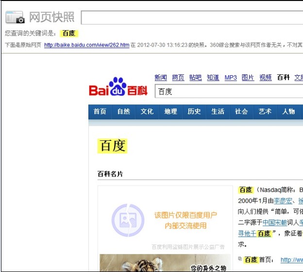 这个截图是笔者用360搜索,在结果中找到百度的产品时,点开就是这样,细心的读者会发现,这就是一个网页快照,而且快照日期显示的是2012年7月30日,距今已有一个月,这就是我们在360搜索结果中看到的实际例子,而非百度产品则显示正常。 360是这样对待百度,反观百度是怎么对待360呢?