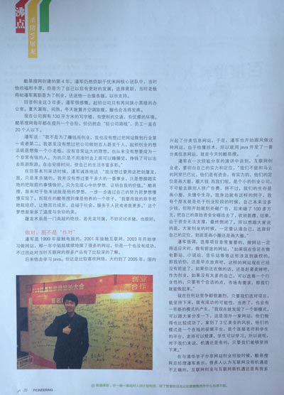 酷易搜网创建的第4年,潘军仍然供职于优米网核心团队中,当时他的福利丰厚,但是为了自己以后有更好的发展,选择离职,当时老板得知潘军离职是为了创业,还送他一台服务器,以示支持。 回首创业这3年多,潘军很感慨。起初公司只有两间狭小黑暗的办公室。夏天漏雨、闷热,冬天就算开空调取暖,也会脚冻得发疼。 现在公司拥有130平方米的写字楼,有便利的交通,有优雅的环境。酷易搜网每年都在提升一个台阶,但仍然走“轻公司路线”,员工一直在50个人以下。 潘军说,“我不是为了赚钱而创业,我也没有想过把网站做到行业第一或者第二。我甚至没有想过把公司做到百人甚至千人,起初创业的想法就是想做一个小老板,没有非常远大的理想,也从来没有想要成为一个非常有钱的人。为的只是不用准时的去上班可以睡懒觉,挣钱了可以出去旅旅游游。自由安排时间,使自己的生活丰富多彩。” 潘军在回答本刊采访时候,诚恳回答说:“我没想过要用这把剑屠龙,我,只是来杀猪的。我并没有想过要干多大的一番事业,只是想脚踏实地的把眼前的事情做好。只为完成心中的梦想、证明自我的价值。”酷易搜,原来对于他来说就是他的梦想,一步一步通过自己的努力把他的梦想慢慢实现了。而现在的酷易搜则像是他养的一个孩子,“我要用我的双手把她栽培好,让她茁壮成长,造福于社会,服务于人民或者是更多。”这个梦想渐渐多了温度与亲切的美。 屠龙术虽是一门高超的绝技,若无龙可屠,不妨试试杀猪,也很好。 做对,而不是“作对” 潘军是1999年接触电脑的,2001年接触互联网,2003年开始学习做网站,当时开源的系统并不是太多,有很多网站都是分为免费版和商业版,他开始用的是一些免费版,感觉不能满足自己的需求,于是就去买了一个商业版的。 后来潘军报名参加一个学习班,学习一些建站的程序、和平面设计,之后就去一家网站去上班,开始在互联网圈子里折腾,有个网上认识的朋友推荐他做互联网的 idc,于是去代理了一家,后来感觉自己被骗了,因为,当时代理的idc非常多,竞争也非常激烈,很难卖出去。于是潘军索性自己去注册了一大堆域名,用一些建站系统做了很多的网站,当时比较流行做sp的业务,分成也比较高,所以当时也做了一阵子SP,当然,现在没有sp了,后来又做过电影站和聊*室。那一年中陆陆续续地做了很多的网站,但是一个也没有成功,不过因此对当时互联网的很多产品有了比较深的了解。 (责任编辑:admin) |